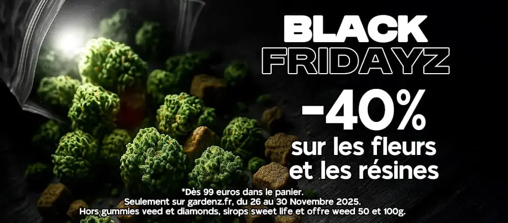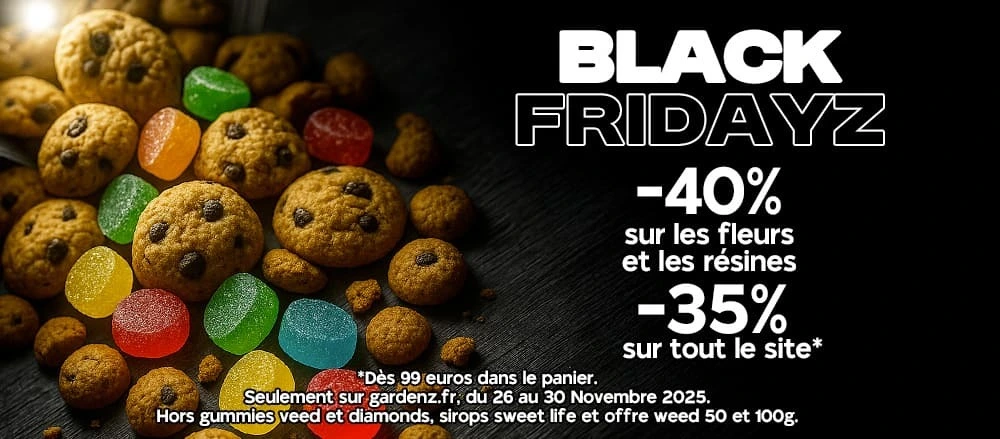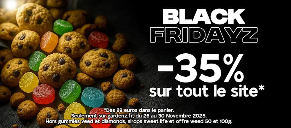 Profite aussi de notre offre Black Friday -35% valable sur l’ensemble du site* : gummies THC, puffs THC, space cakes THC, accessoires et toutes nos références hors fleurs et résines. Une réduction bien posée pour tester ce que tu avais en vue ou découvrir des produits plus atypiques, toujours avec la qualité Gardenz. Simple, efficace, et parfait pour faire le plein sans se prendre la tête.