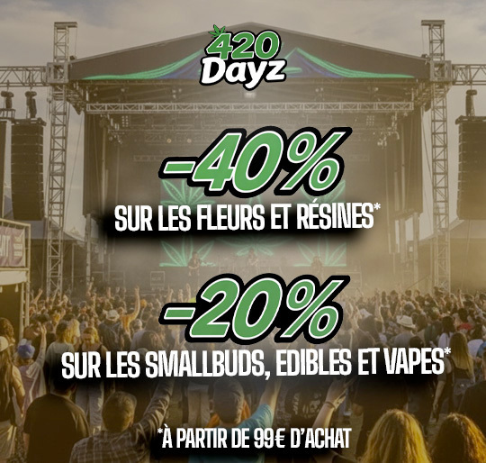 Les fleurs CBD et les résines CBD bénéficient de -40% sur l'ensemble de la sélection disponible pendant la période. Les produits en rupture de stock au moment de la commande ne sont pas garantis.