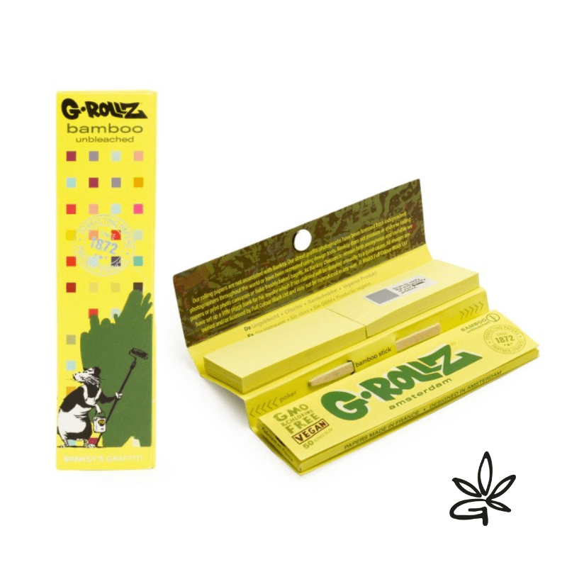 Chaque feuilles à rouler Banksy de chez G-Rollz est fabriquée en France à partir de fines fibres de bambou pressées et de sève d'acacia naturelle en guise de gomme.