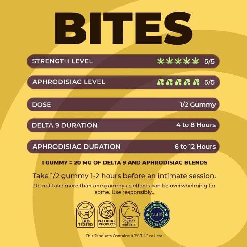 Les Sex Bites Cerise NUUD ont Ă©tĂ© spĂ©cialement Ă©laborĂ©s pour accompagner la sensualitĂ© et le bien-ĂȘtre fĂ©minin. Leur recette associe le Delta 9 THC Ă des extraits naturels reconnus pour leurs propriĂ©tĂ©s aphrodisiaques, comme la Damiana, le Muira Puama et la Maca, crĂ©ant une synergie qui Ă©veille le dĂ©sir et renforce lâĂ©nergie intime.