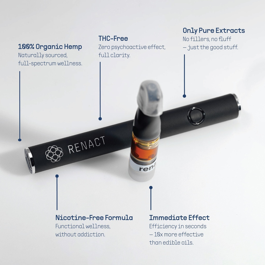 Besoin de couper le bruit et de retrouver ton calme ? Le Kit REST RENACT, c’est un vape pen rechargeable (3 niveaux de puissance) + une cartouche pré-remplie 0,5 ml à la saveur chanvre. Sa formule CBD est pensée pour un soutien discret, au bon moment : 2 à 3 bouffées, 3 à 4 fois par jour selon tes besoins, sans vapoter en continu. Qualité premium : distillat non dilué, extraction à froid, chanvre biologique, sans nicotine, sans THC, sans PG/VG ni additifs. Simple, propre, efficace : tu inspires, tu souffles, tu relâches.